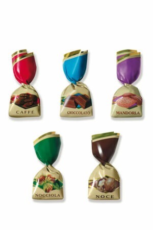 Candies filled with fine cream with the flavors of: hazelnut, walnut, almond, chocolate, coffee. Packaged in a 1kg bag with individually wrapped sweets.