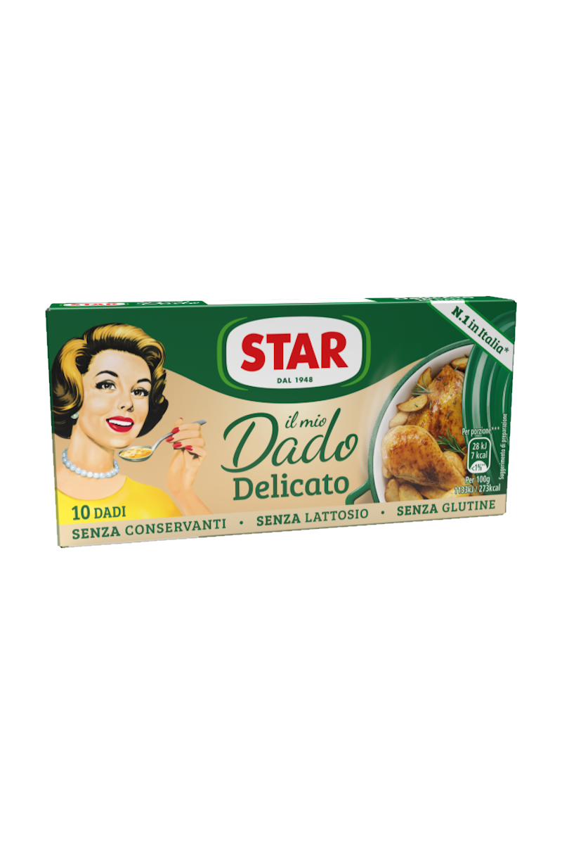 IL MIO DADO STAR Delicato is ideal for preparing light and daily recipes. With its gentle flavour it is perfect for making velvety sauces, soups, seasonal vegetables, and white meat dishes even better. For the broth, place 1 tablet in 500 ml of boiling water. Or as a flavouring: 1 whole or chopped tablet in a pot or pan.