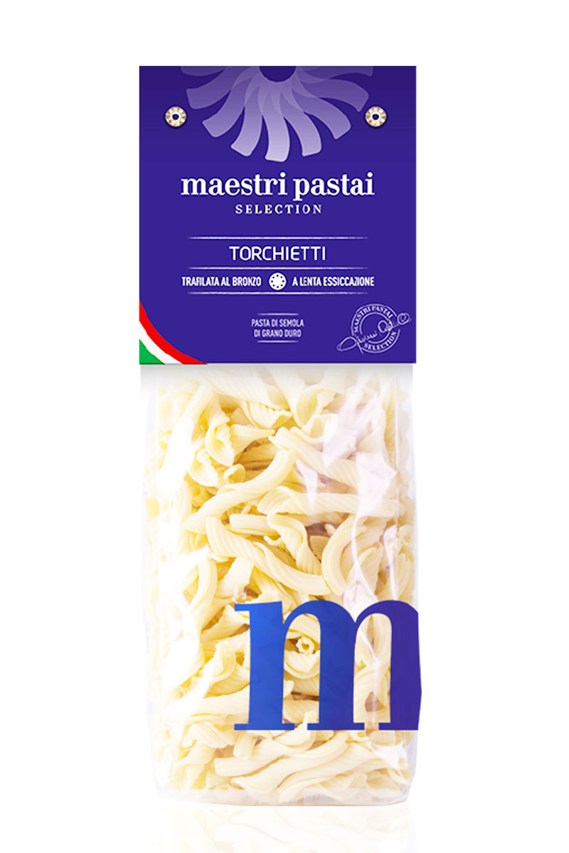 A medium length, twisted pasta type that resembles torches or bells. A process carried out according to the true artisan method, genuine ingredients and a pasta factory with a quality control grown by the experienced hands of whom has been creating pasta since generations. Only the finest durum wheat semolina and cold water are used for kneading. Our pasta is bronze drawn, at a low and constant temperature: between ten and fifteen hours, depending on the shape. Our pasta creators control every single die, every piece, every batch and personally bag it to bring to your table a tasty pasta with perfect porosity. Simply good, truly handmade.